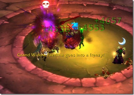 Faerlina will go into a Frenzy after every minute has elapsed from the last dispel (or a minute after the fight begins). She will hit the tank extremely hard and he will not be able to survive for more than a few seconds. The only way to dispel Frenzy is to bring one of her mobs on top of her and kill it. Only then can the effect be dispelled.